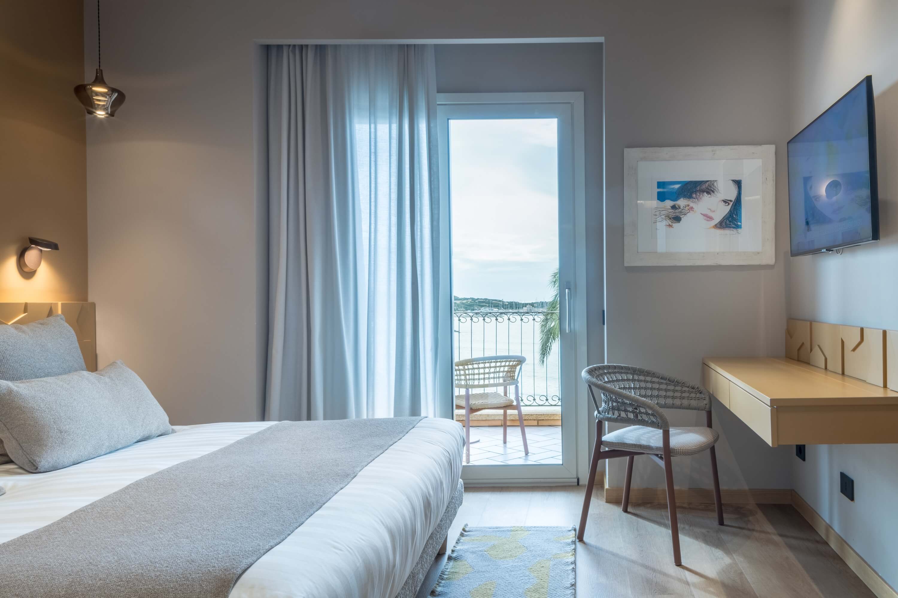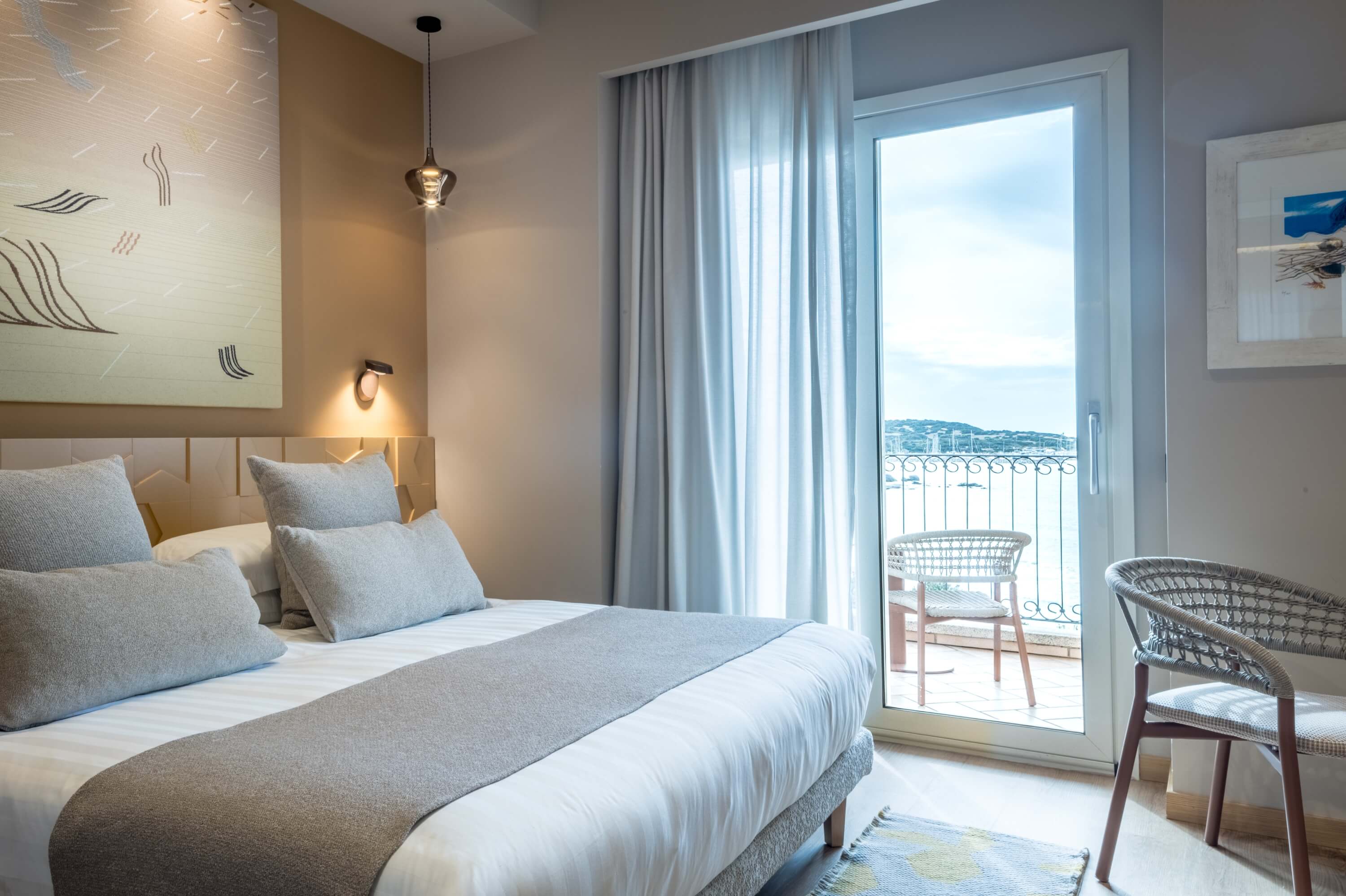 Chambre d'hôtel avec lit, balcon vue océan et bureau.